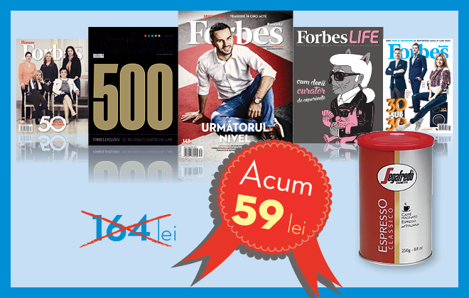 Revista Forbes - abonament pe 12 luni + cadou o cutie de cafea Segafredo la pretul de doar 59 lei, prin Forbes Romania! Abonamentul cuprinde: 2 editii/luna Forbes Romania + 1 editie/luna Forbes Life + Forbes Top 500 Miliardari!